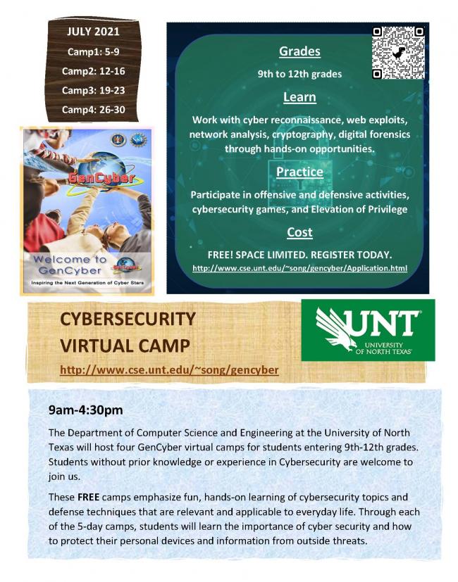 The UNT Department of Computer Science and Engineering is hosting Cybersecurity camps virtually in July (http://www.cse.unt.edu/~song/gencyber/). The goal is to develop cybersecurity awareness and teach cybersecurity fundamentals to middle/high school students. Students entering 9th-12th grades with or without prior knowledge or experience in cybersecurity are welcome to join. In the camp, students will be exposed to cryptography, network security and digital forensics through highly engaging and interactive activities including games, hands-on labs, animation/simulations, videos, and invited speakers. The camps are free and emphasize fun, hands-on learning of cybersecurity topics. Starting from July 5, each camp is for a week, until July 30. Registration details can be found at http://www.cse.unt.edu/~song/gencyber/Application.html If you have any questions, please contact us at (940) 565-2341.